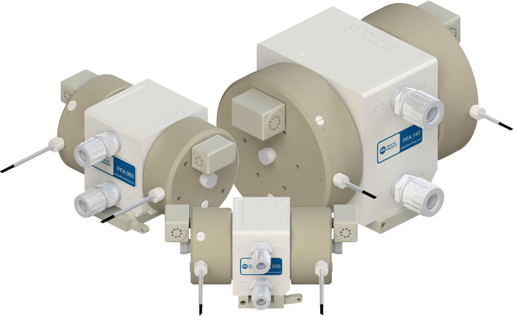 PFA Series pumps are the ideal solution for ambient temperature and ultra-pure recirculation or delivery applications where fiber optic sensors are required for optimum systems control. These PTFE and PFA pumps are completely metal free and operate with fiber optic sensors and an external solenoid valve. They perform safely and reliably running continuously throughout their warranty period. They offer air supply pressures up to 7 Bar (100 psi) and operate in thermal cycling applications with fluid temperatures up to 100?C (212?F).