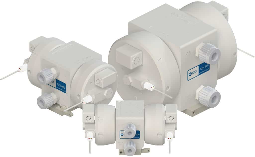 PXH Series pumps are the ideal solution for high temperature and ultra-pure recirculation or delivery applications where proximity sensors are required for optimum systems control. These PTFE and PFA pumps are completely metal free and operate with proximity switches and external solenoid valve. They perform safely and reliably running continuously throughout their two-year warranty. They offer air supply pressures up to 5.5 Bar (80 psi) and operate in thermal cycling applications with fluid temperatures up to 145?C (293?F).